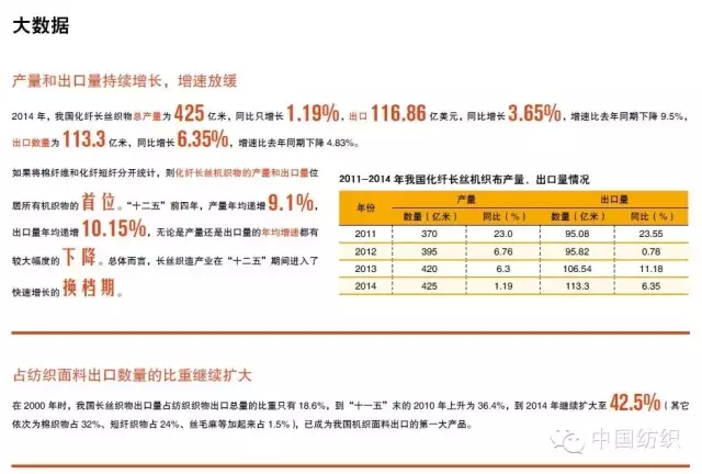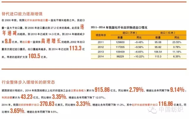 据统计,“十二五”前四年,化纤长丝机织物产量年均递增9.10%,出口量年均递增10.15%,无论是产量还是出口量的年均增速都有较大幅度的下降。总体而言,长丝织造产业在“十二五”期间进入了快速增长的换档期。需要指出,化纤长丝织物由于细分产品丰富、用途广泛,加之“十二五”以来,产品品质有较明显的提升,是纺织织物中出口表现最好的产品。在国内市场消费能力逐年增长的情况下,逐年减少的进口数量表明国产化纤长丝织物的技术水平和产品档次在逐年提高,目前已基本接近世界先进水平,替代进口的能力在不断增强。