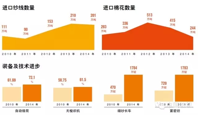 除此之外,进口纱的冲击也是影响企业调整产品结构的主要原因。在中国进口纱不需配额限制,税费也只有5% 的关税,这使得东南亚地区低价棉纱大量涌入国内。2014 年中国棉纺织行业协会发布的经济运行报告中指出:“2014 年我国累计进口棉纱线201 万吨,同比下降4.2%,尽管2014年棉纱进口量同比下降,但进口绝对数量不低。进口纱量最大为印巴纱,其中印度棉纱自2010 年占进口总量的11%快速上升至2014年的26%,另外,越南棉纱线进口量占比也呈快速增长趋势,从2010年占10%增长到2014 年的20%,占比基本接近印巴纱。”