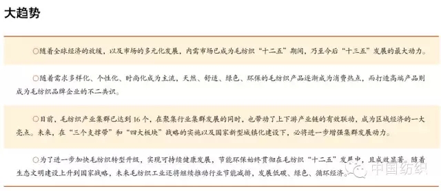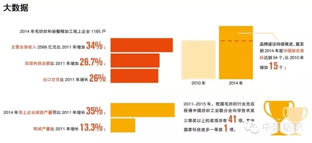 “总体来说,‘十二五’期间,我国毛纺织行业的规模、效益实现了稳步增长。特别是在创新驱动的引领下,行业结构调整持续深入。其中,长三角和珠三角毛纺行业加快了向文化创意、设计、品牌、销售渠道等高价值产业链延伸;中部及西部依托原料等优势加快建成了完整的绒毛产业链,产业集聚度得到了很大提升,毛纺织产业集群达到16 个。”中国毛纺织行业协会会长黄淑媛表示:“‘十二五’期间,毛纺织行业在骨干龙头企业的带动下,特色专业企业不断壮大,各类企业专业化协作,优势互补,灵活组织生产,不仅实现了产业链上下游的平衡发展,更使行业综合竞争力得到进一步提升,国际化程度明显提高。”