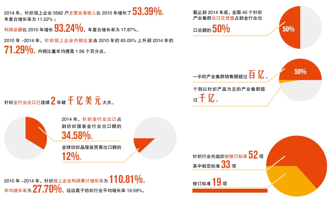 “十二五”期间,在全球化和科技进步的背景下,我国针织行业依托创新驱动和转型发展,实现了稳定发展。规上企业主营业务收入同比增速、利润总额同比增速、固定资产投资实际完成金额同比增速、施工项目数同比增速、新开工项目数同比增速和竣工项目数同比平均增速均保持着高速增长,远远高于纺织行业。