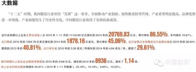 回头总结这五年,中国服装业的主题可以用“创新”与“发展”来概括,通过不断应对各种前所未有的困难和压力,积极探索产业发展的新方法,产业仍然取得了很大的成绩,为下一步发展打下坚实的基础。