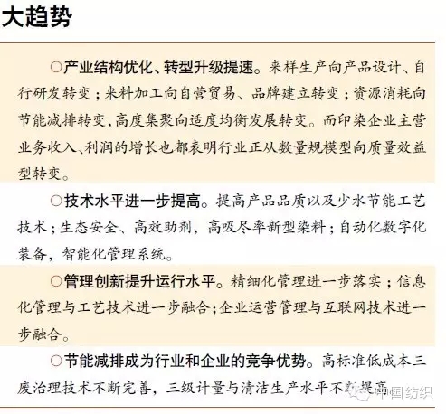不仅如此,“十二五”期间,印染行业的管理水平也得到了质的提升。其中,精细化管理进一步落实,信息化管理与工艺技术进一步融合,企业运营管理与互联网技术进一步融合。“随着三级计量管理、化学品管控、ERP 管理等大量信息化、精细化、智能化管理的普及和应用,大大提升了印染行业的产品质量和企业生产效率,更也为行业的绿色发展提供了源头保障。”