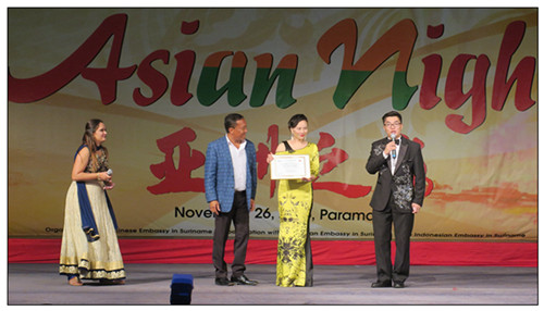 10月26日,值此中国与苏里南建交40周年之际,苏里南中国大使馆官邸特举行盛大庆典日,苏里南总统和总统夫人、中国驻苏里南大使及夫人、联合国驻苏机构以及美、法、荷、印、印尼等多国大使出席和当地名流出席了本次活动。中国十杰设计师、香黛宫旗袍创始人龚航宇应中国驻苏里南大使邀请盛装出席,以一场融贯中西的现代美,用旗袍架起了两国文化交流的友谊桥梁。