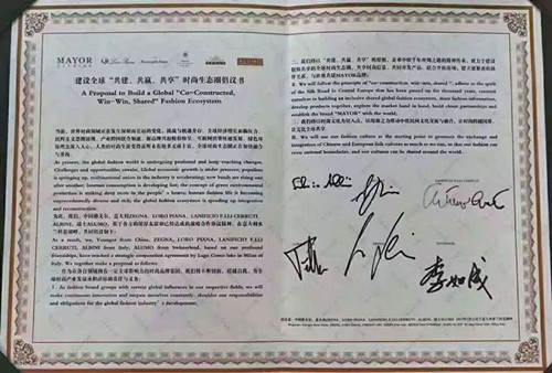 二、我们将以“共建、共赢、共享”的原则,秉承中欧千年丝绸之路的精神传承,致力于建设包容共享的全球时尚生态圈,开诚布公地交流时尚信息、共同开发产品、联合开拓市场,建立更紧密的伙伴关系,共同打造“MAYOR”品牌;