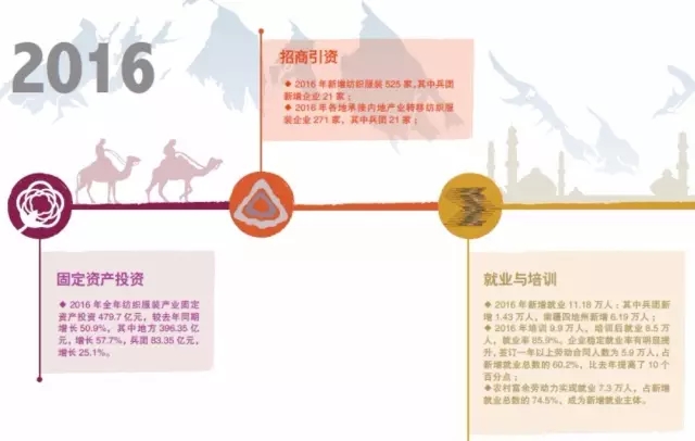 2014 年,第二次中央新疆工作座谈会提出要大力促进新疆发展纺织服装产业带动就业。从2014 年开始,新疆便驶入了新一轮经济发展的快车道,尤其是纺织服装产业,更是实现了飞速发展,在全国各省市纺织服装产业板块中可谓“一枝独秀”。 2015 年,新疆全区纺织服装产业固定资产投资达317.9 亿元,较2014 年度增长230.6%。翻倍的增长态势在中国经济进入“新常态”,制造业转型升级进入深水区的当下显得尤为抢眼。 经过前两年的经验积累和产业建设,2016 年成为了新疆纺织服装产业乘胜追击,并在调整中发展的重要一年。记者从新疆自治区发展纺织服装产业带动就业领导小组办公室获悉:2016 年全年纺织服装产业固定资产投资479.7 亿元,较去年同期增长50.9% ;企业数量方面,截止2016 年12 月底,在自治区纺就办备案纺织服装企业数量达到2083 家(其中兵团企业119 家),较上年底新增525 家(其中兵团21 家);就业方面, 2016 年新疆全区纺织服装产业新增就业11.18 万人,其中南疆四地州新增就业6.19 万人,占地方新增就业的63.2%。 产业壮大,就业增加,纺织服装产业已成为新疆“促就业、保民生”的重要产业,成为了维持民族团结、社会稳定的重要抓手,成为了新疆发展史上浓墨重彩的一章。