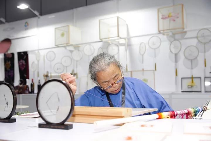 最年长艺术家 在中华民族服饰展区有一位与众不同的人。没错!她就是80多岁高龄的苏州绣娘。虽已华发,却一如芳年那般一针一线的勾勒出精美绝伦的绣品。