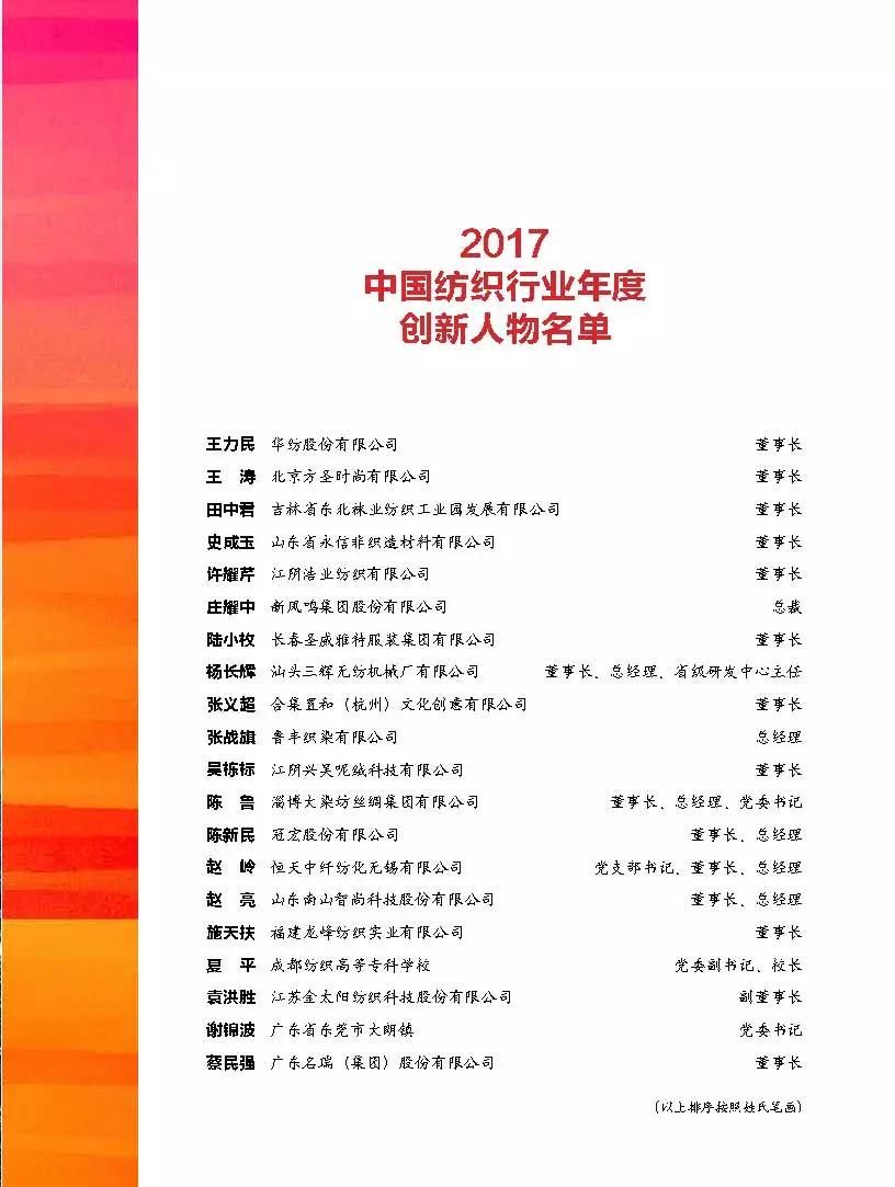 自2005年中国纺织工业联合会在全行业开展年度创新人物评选活动以来,已先后表彰了220名创新人物,这些创新人物在供给侧改革、智能制造、绿色环保、协同创新等方面对重塑中国纺织核心竞争力,引领全行业高质量发展起到了重要的支撑作用。表彰、总结和学习这些创新人物的先进事迹和成功经验,是建设纺织强国不可或缺的重要推手。 2017中国纺织行业年度创新人物评选本着公平、公正、公开的原则,中国纺织工业联合会根据《中国纺织行业年度创新人物评选管理办法》有关规定,由相关专业协会和单位推荐,经评审委员会评审,评选表彰活动领导小组审定,最终授予王力民等20位同志“2017中国纺织行业年度创新人物”荣誉称号(名单附后)。在他们当中,既有已享受国务院特殊津贴的老纺织人王力民,又有80后年轻有为的“创二代”王涛;既有巾帼不让须眉的许耀琴,又有为行业培育全新人才的高校领军人夏平……他们的创新事迹如股股清流,汇聚成海,引航纺织工业高歌猛进。 为了鼓励和引导全行业以创新人物为榜样,埋头实干、开拓创新,中国纺织工业联合会党委书记兼秘书长高勇特为本次创新人物写序《创新之路 未有穷期》、中国纺织工业联合会会长孙瑞哲写序《不忘创新初心 打开创新之窗》,往届创新人物代表深圳歌力思服饰股份有限公司董事长夏国新撰文《歌力思的创新思考与实践》进行经验分享。
