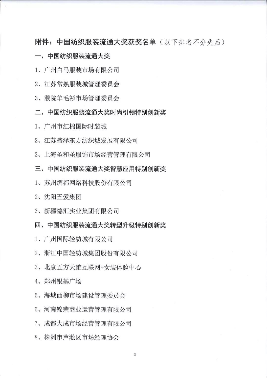 5月21日,由中国纺织工业联合会、常熟市人民政府主办,中国纺织工业联合会流通分会、江苏常熟服装城管理委员会、常熟服装城集团有限公司承办的首届中国纺织服装流通大奖颁奖典礼暨纺织服装智慧商城高峰论坛在江苏常熟举办。 中国纺织工业联合会副会长、中纺联流通分会会长夏令敏,中国服装行业协会顾问蒋衡杰,中国纺织建设规划院院长冯德虎,中纺联流通分会副会长、《纺织服装周刊》杂志社社长钱晋,中国服装协会专职副会长杨金纯,中纺联流通分会副会长兼秘书长张海燕,常熟市智慧城市建设领导小组办公室主任、经信委主任朱晓峰以及各地方协会有关领导和嘉宾出席了本次活动。活动由中纺联流通分会副会长徐建华主持。 以专业市场为代表的纺织服装流通领域,经过改革开放以来四十年的发展,目前已经进入转型升级的攻坚阶段。为进一步提升全国纺织服装流通管理服务水平,实现纺织服装流通领域向集约化、专业化、智慧化、绿色化、品牌化、国际化方向迈进,中纺联流通分会在常熟服装城管委会的大力支持下,以“加强基础管理、培养流通人才、提升流通效率”为宗旨,在全国纺织服装流通流域开展“中国纺织服装流通大奖”评选活动,重点评比表彰全国纺织服装流通领域在时尚引领、智慧应用、转型升级等方面表现突出的标杆集体和领军人物、十佳职业经理人。“流通大奖”自去年八月正式启动以来,历经动员部署、自查申报、审核验收、专家评审、名单公示等环节,今天在常熟2018江南国际时装周暨第十九届中国江苏(常熟)服装服饰博览会上一一揭晓。 中国纺织工业联合会副会长、中纺联流通分会会长夏令敏在致辞时表示,此次大奖评选活动,旨在表彰纺织服装流通领域在基础管理、时尚引领、智慧应用、转型升级等方面表现突出的标杆企业、领军人物和职业经理人,以达到加强技术管理、培养流通人才、提升流通效率的目标。希望获奖单位和个人,再接再厉,继续担当引领行业创新发展的标杆和推动行业转型升级的践行者,继续为推动我国纺织服装流通领域的高质量发展而努力。 他强调,目前我国经济发展由高速增长阶段转向高质量发展阶段,纺织服装流通流通行业要实现高质量发展,出发点就是推动行业实现由大到强的转变,关键点是实现新旧动能的转换,落脚点是满足人民日益增长的美好生活需要。要实现新旧动能的转换就必须要把重心落实在创新上,要通过理念创新、技术创新、品牌创新、渠道创新、模式创新、管理创新和服务创新等全面创新,培育新的发展动能。 他指出,当前要进一步深化供给侧结构性改革,加快专业市场的智慧应用,推动物联网、大数据、云计算、人工智能、互联网和实体产业的融合,推进智慧商城建设,把智慧商城建设成为产业的大数据中心、商业模式创新中心和时尚体验中心。 常熟市智慧城市建设领导小组办公室主任、经信委主任朱晓峰在致辞时表示,常熟纺织服装产业已经实现两个“千亿”,一个是生产制造规模达到一千亿元,另外一个是市场交易达到一千亿元,常熟服装城已经成为常熟服装产业的一个缩影。历经33年,在互联网+时代背景下,常熟服装城顺势而为,探索智慧商城建设,加快对纺织服装专业市场进行数字化集成改造,打造了精准、营销供应链和时尚快速反应链。智慧商城是新消费时代背景下专业市场的新阶段,是专业市场新定义,也是产业转型的新目标。希望以此会议为契机,通过思想碰撞,不断加快常熟服装产业模式创新,实现合作共赢。 中纺联流通分会副会长、纺织服装周刊杂志社社长钱晋宣读了《关于表彰2016-2017年度中国纺织服装流通大奖获奖单位和个人的决定》,决定授予广州白马服装市场有限公司、江苏常熟服装城管理委员会、濮院羊毛衫市场管理委员会等单位“中国纺织服装流通大奖”荣誉称号,授予广州市红棉国际时装城等单位“中国纺织服装流通大奖时尚引领特别创新奖”荣誉称号,授予苏州绸都网络科技股份有限公司等单位“中国纺织服装流通大奖智慧应用特别创新奖”荣誉称号,授予广州国际轻纺城有限公司等单位“中国纺织服装流通大奖转型升级特别创新奖”荣誉称号,授予卜晓强等个人“中国纺织服装流通大奖年度领军人物”荣誉称号,授予何伟等个人“中国纺织服装流通大奖十佳职业经理人”荣誉称号(名单附后)。夏令敏等领导和嘉宾为获奖单位、个人颁发奖牌、证书并合影留念。 为推动专业市场高质量转型发展,近年来中纺联流通分会先后组织编制了《绿色纺织服装专业市场评价标准》、《我国纺织服装专业市场发展白皮书》等一系列研究成果。会上,中纺联流通分会正式对外发布《关于推进纺织服装智慧商城建设的指导意见》,提出纺织服装专业市场是我国纺织服装行业的基础性先导型产业、重要流通平台和价值实现平台;专业市场经过四十年发展,历经初步形成、逐步发展、全面建设、高速扩张四个阶段,现已全面进入转型升级阶段,必须进一步深化供给侧结构性改革,加快专业市场智慧应用,推动物联网、大数据、云计算、人工智能、互联网和实体产业融合,推进智慧商城建设,实现纺织服装流通行业新旧动能转换和高质量发展,把纺织服装智慧商城建设成为产业大数据中心、商业模式创新中心、品牌孵化中心和时尚体验中心,