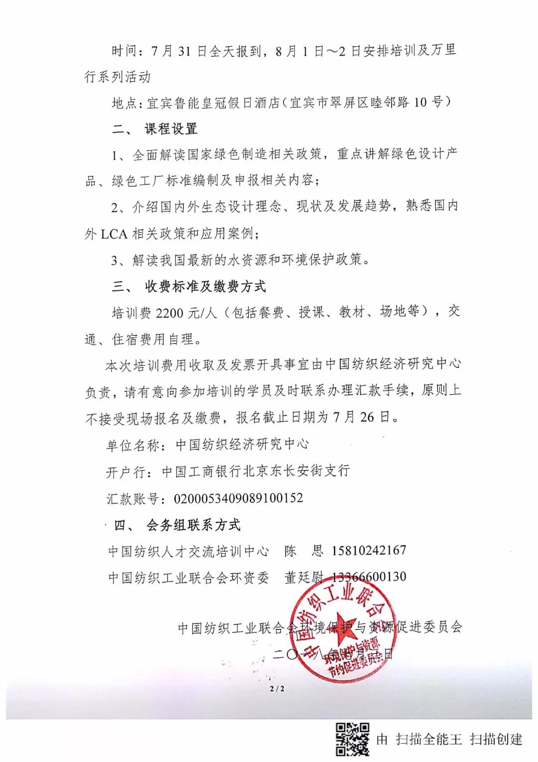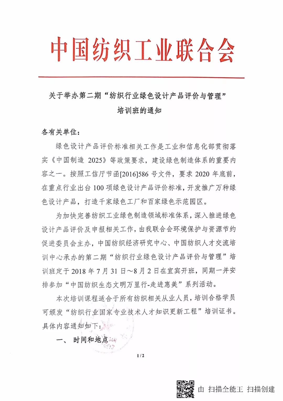 为加快完善纺织工业绿色制造领域标准体系,深入推进绿色设计产品评价及申报相关工作,由我联合会环境保护与资源节约促进委员会主办,中国纺织经济研究中心、中国纺织人才交流培训中心承办的第二期“纺织行业绿色设计产品评价与管理”培训班定于2018年7月31日~8月2日在宜宾开班,同期一并安排参加“中国纺织生态文明万里行-走进惠美”系列活动。