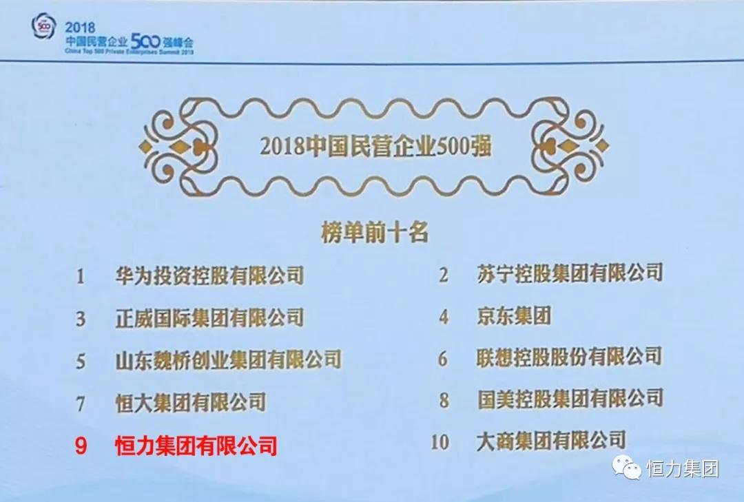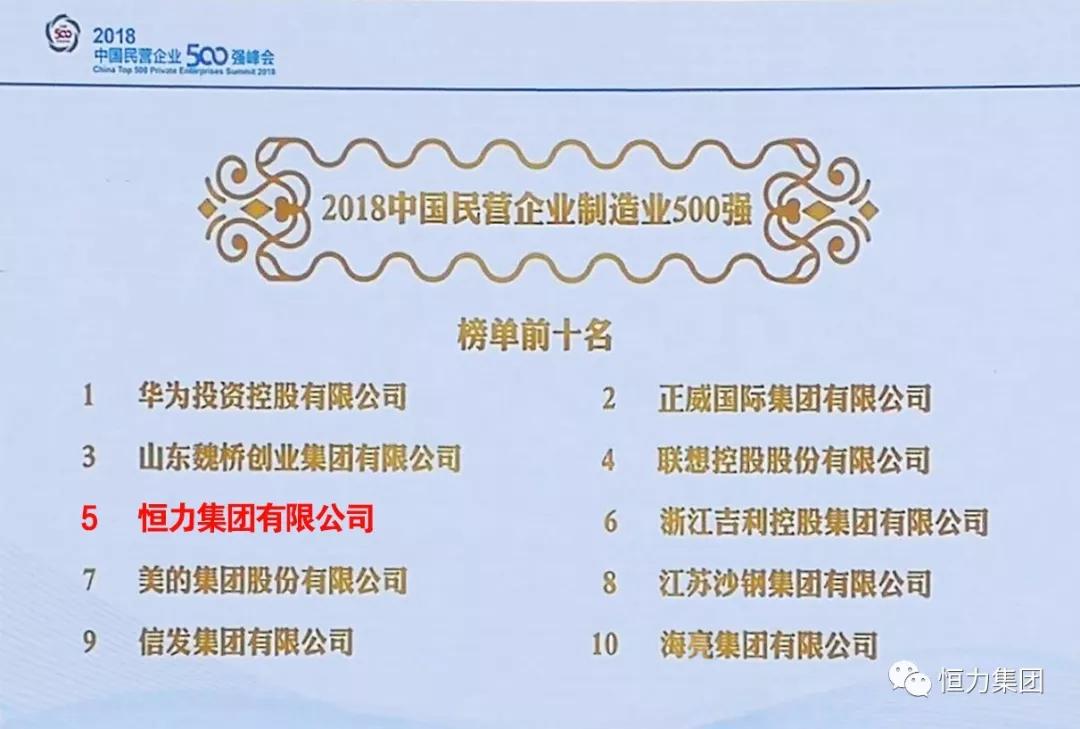 | 恒力集团位列“2018中国民营企业500强”榜单第九位 | | 作者: 时间:2018-09-01 评论(0) | | 8月29日,全国工商联在沈阳召开“2018中国民营企业500强峰会”。会议期间发布了“2018中国民营企业500强”系列榜单,恒力集团位列中国民企第九位、民企制造业第五位,也成为化学原料和化学制品制造业首位。至此,恒力集团已连续六年荣列中国民企十强。 “2018中国民营企业500强” 榜单前十名