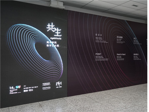 展览于10月20日到26日在北服 图书馆一层展出。参展作品讨论的主题是“共生SYMBIOSIS”,包括了年青一代对当代社会、人文、自然环境同时生存与共同发展的跨界思考,由美术学院“北京服装学院——中央美术学院”双培项目的16 位同学在双校教师指导下合作完成。同学们在课程中运用互动影像、编程装置、参数化设计等多种新技术与艺术理念相结合,向观众表达创作者更深层次的艺术诉求。数件展览作品运用了素描手稿、CG 制作、交互视频、多媒体装置等形式,体现了“科学·艺术·时尚”在未来社会实现跨界协作的主题思想,将观众带入奇幻的虚拟情景中,感受数字化艺术面对人类社会诸多问题所带来的冲击与思考。