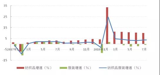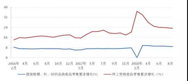 内销市场新旧业态同时提速。根据国家统计局数据,2018年前三季度,我国居民人均可支配收入实际增长6.6%,消费支出实际增长6.3%,均快于人均GDP6.2%的增长水平,消费贡献率提升至78%,与民生紧密相关日用消费品是内需增长主要拉动力。纺织服装产品传统业态销售好于上年,1~9月全国限额以上服装鞋帽、针纺织品类零售额同比增长8.9%,增速较上年同期提高1.7个百分点,处于近三年来的较高增长水平。新兴业态保持快速增长,全国网上穿着类商品零售额同比增长23.3%,增速高于上年同期4.1个百分点。
