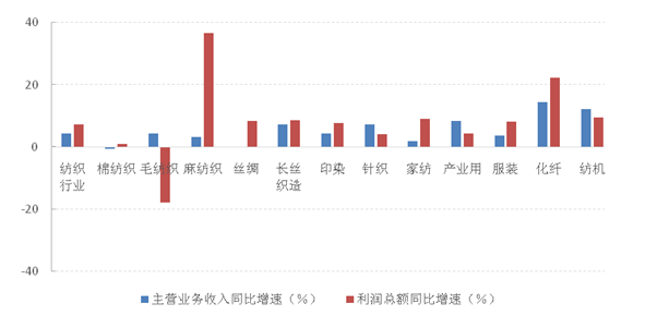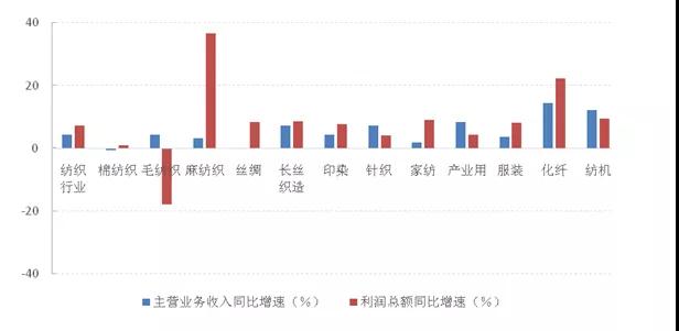 经济效益环比持续改善。1~9月,全国3.6万户规模以上纺织企业累计实现主营业务收入42197.6亿元,同比增长4.2%,增速较上年同期放缓3.5个百分点,但较今年上半年加快0.1个百分点;实现利润总额1980.8亿元,同比增长7.1%,增速较上年同期放缓3.5个百分点,但高于今年上半年增速4.7个百分点。从产业链结构上看,化纤行业由于产业集中度提高以及大型企业向上游炼化环节延伸等原因,效益增速稳定在较高区间,1~9月主营业务收入和利润总额同比分别增长14.4%和22.3%,分别拉动纺织全行业主营业务收入和利润增速2和3.2个百分点。