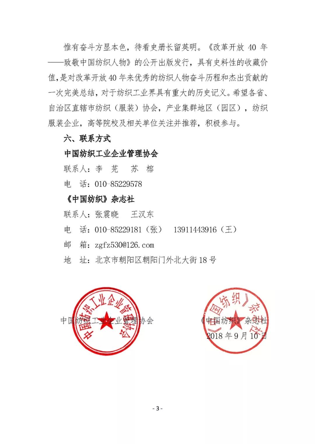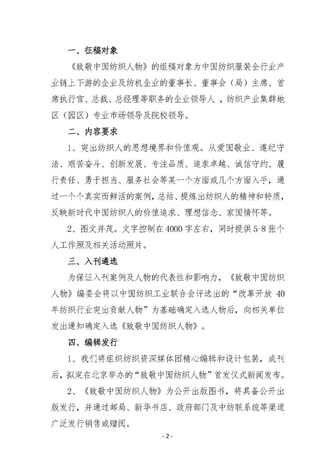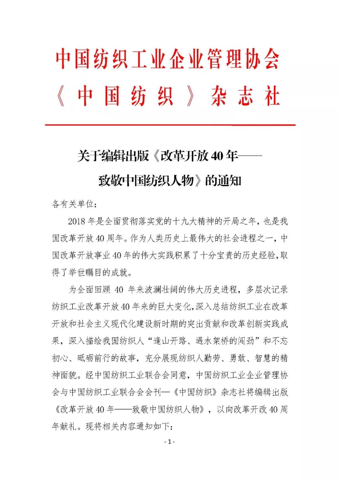 为全面回顾40年来波澜壮阔的伟大历史进程,多层次记录纺织工业改革开放40年来的巨大变化,深入总结纺织工业在改革开放和社会主义现代化建设新时期的突出贡献和改革创新实践成果,深入描绘我国纺织人“逢山开路、遇水架桥的闯劲”和不忘初心、砥砺前行的故事,充分展现纺织人勤劳、勇敢、智慧的精神面貌。经中国纺织工业联合会同意,中国纺织工业企业管理协会与中国纺织工业联合会会刊—《中国纺织》杂志社将编辑出版《改革开放40年——致敬中国纺织人物》,以向改革开改40周年献礼。现将相关内容通知如下: