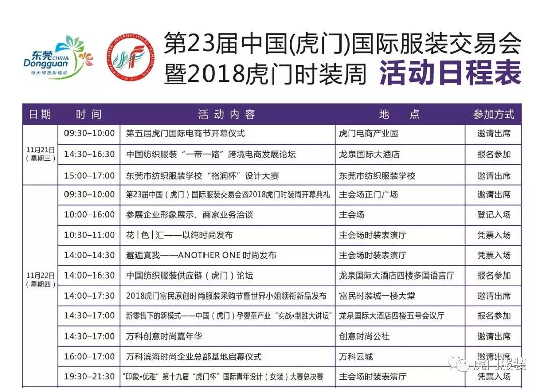 中国纺织服装“一带一路”跨境电商发展论坛 随着互联网、信息技术应用的快速发展,以跨境电商为代表的新型贸易方式越来越受到消费者的青睐,跨境电商已经成为推动中国外贸增长的新引擎,2018年,中国跨境电商交易规模预计将达到8.5万亿。 11月21日14:30-16:30,将在龙泉国际大酒店举办的中国纺织服装“一带一路”跨境电商发展论坛,将针对当前跨境电商趋势与跨境电商发展催化下产生的新机遇及挑战,汇聚“一带一路”、跨境电商领域的战略研究和实操型专家、学者和企业家们,共同探讨如何通过电商新业态、新模式,积极推动我国纺织服装产品和服务拓展“一带一路”商贸发展。 东莞市纺织服装学校“格润杯”设计大赛 东莞市纺织服装学校结合虎门服装产业升级和品牌建设的需求,积极发挥服装专业作为该校特色优势专业的示范作用,将于11月21日15:00-17:00在该校服装大楼表演厅举办“格润杯”设计大赛。 大赛作品分三类,即16级毕业设计、擅风视觉创意艺术展、东荷影像“遇见”艺术摄影展。全部参赛作品由该校学生完成。本次大赛将评比出一、二、三等奖及优秀奖若干名。 第23届中国(虎门)国际服装交易会暨2018虎门时装周开幕典礼 第23届中国(虎门)国际服装交易会暨2018虎门时装周开幕典礼定于11月22日09:30-10:00,在主会场虎门会展中心正门广场隆重举行。本届服交会再获国家级机构的鼎力支持,再次邀请中国纺织工业联合会作为活动的特别支持单位,中国纺织信息中心、中国国际贸易促进委员会纺织行业分会、中国服装协会、中国服装设计师协会、广东省服装服饰行业协会、广东省服装设计师协会和东莞市虎门服装服饰行业协会作为主办单位。届时,众多国家行业领导和市、镇领导将出席开幕典礼。 本届服交会参展企业和专业观众区域广泛,除了本土优质企业,更有来自法国、北京、上海、广州、深圳、湖北等地的实力企业、品牌及知名设计师到会参展,采购商来自美国、澳大利亚、法国、意大利等全球数十个国家。展会在集中展示“虎门特色”的服装供应链、全面展现虎门服装时尚魅力的同时,倾力打造国内外服装产业一站式采购平台。 参展企业形象展示、商家业务洽谈 本届服交会展场总面积达30多万平方米,主会场设在虎门会展中心,同时还设有20个分会场。其中,主会场展区面积1万平方米,共有展位520个,特设时装专区、童装专区、面辅料专区、服装印花创意精品展专区、设计师原创展区、电商展区、社会责任展区等,近百家参展企业将进行实力与形象展示,并与来自海内外的客商进行商贸洽谈。
