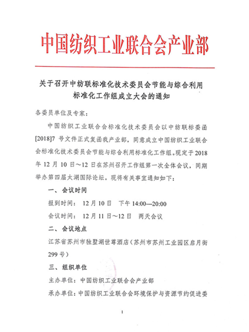 中国纺织工业联合 会标准化技术委员会以中纺联标委函[2018]7号文件正式复函我产业部,同意成立中国纺织工业联合会标准化技术委员会节能与综合利用标准化工作组。现定于2018年12月10日~12日在苏州召开工作组第一次全体会议,同期举办第四届太湖国际论坛。现将有关事宜通知如下: