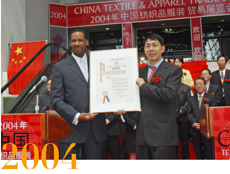 在2004年第五届“纽约展”开幕式上,美国纽约市议员阿伦•杰宁先生代表纽约市议会向中国国际贸易促进委员会纺织行业分会授予“杰出贡献奖”奖牌,以表彰并感谢中国纺织品服装贸易展览会为促进中美纺织业界的交流与合作及促进纽约市旅游经济发展方面做出的杰出贡献。从这届起,纽约市政府每届都会派代表出席展会开幕式,表达他们对展会的欢迎、祝贺和感激。